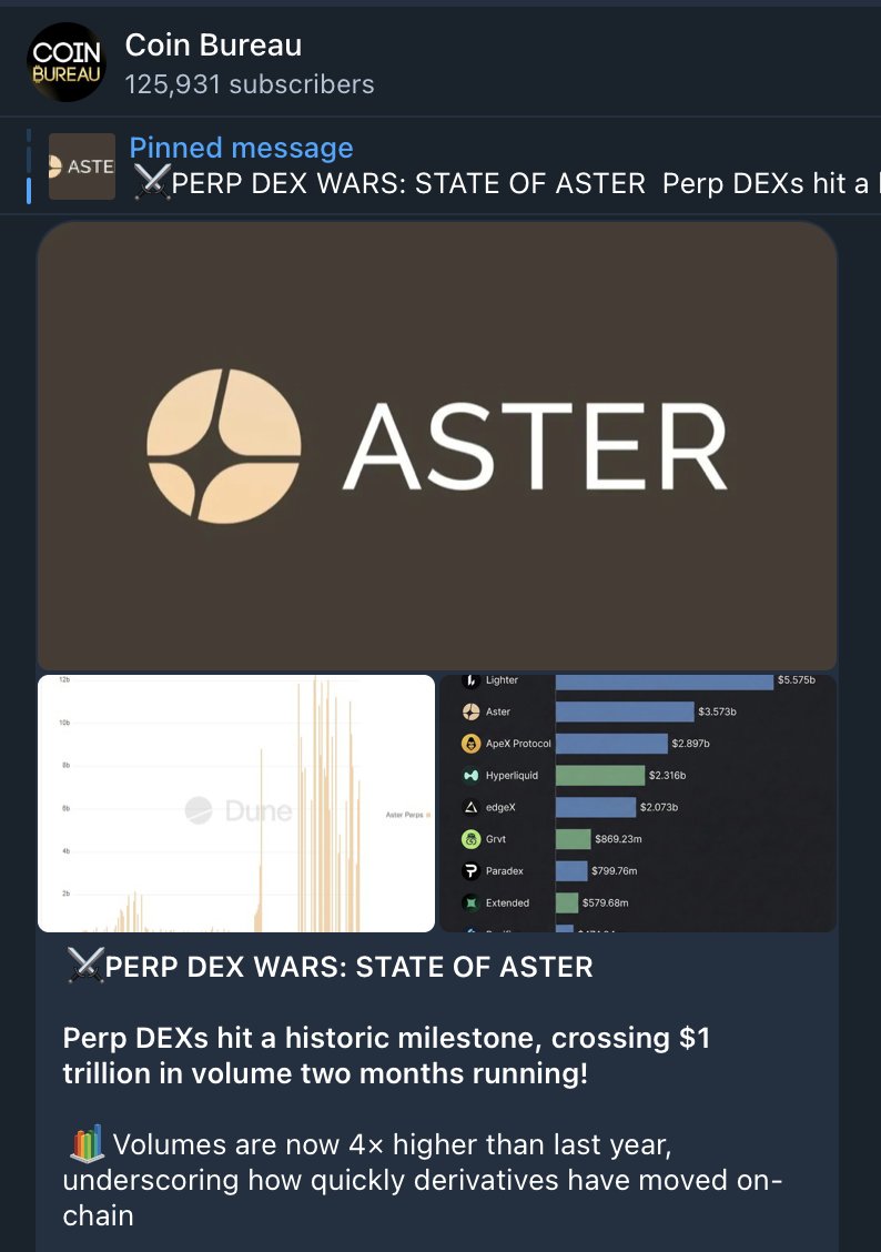 稳定币市值下降$1.81B,而DEX交易量激增——现货上涨18.68%,永续合约飙升230.7%,主要由Aster引领。鲸鱼和机构活跃,BitMine增持$963M ETH,Strategy购入$22M BTC。