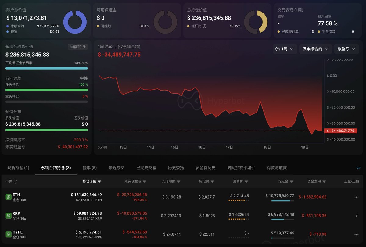 21 号时他的多单浮亏 $4400 万,现在浮亏 $1613 万,已经反弹回来 $2787 万了。