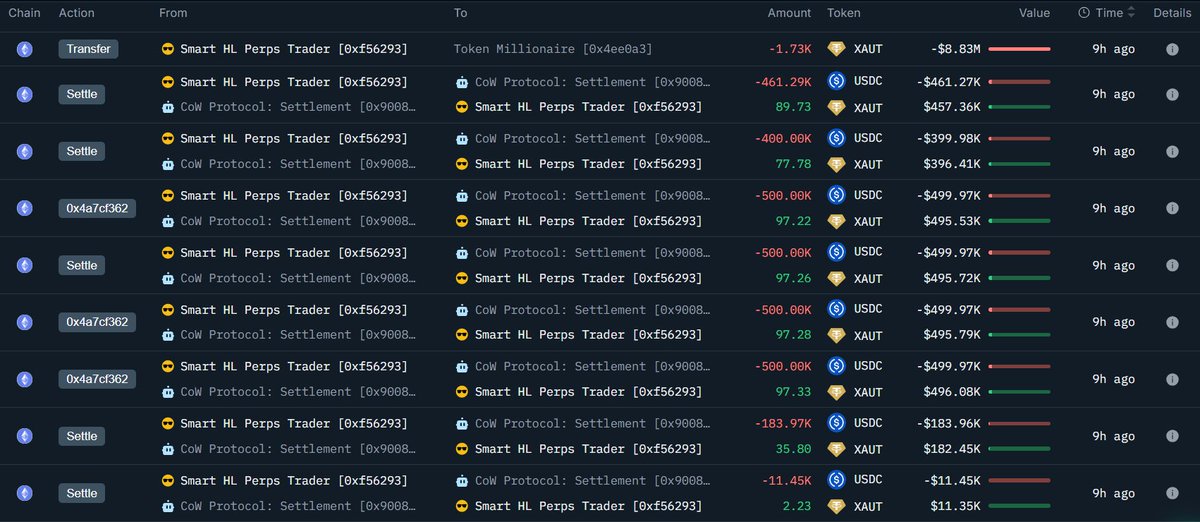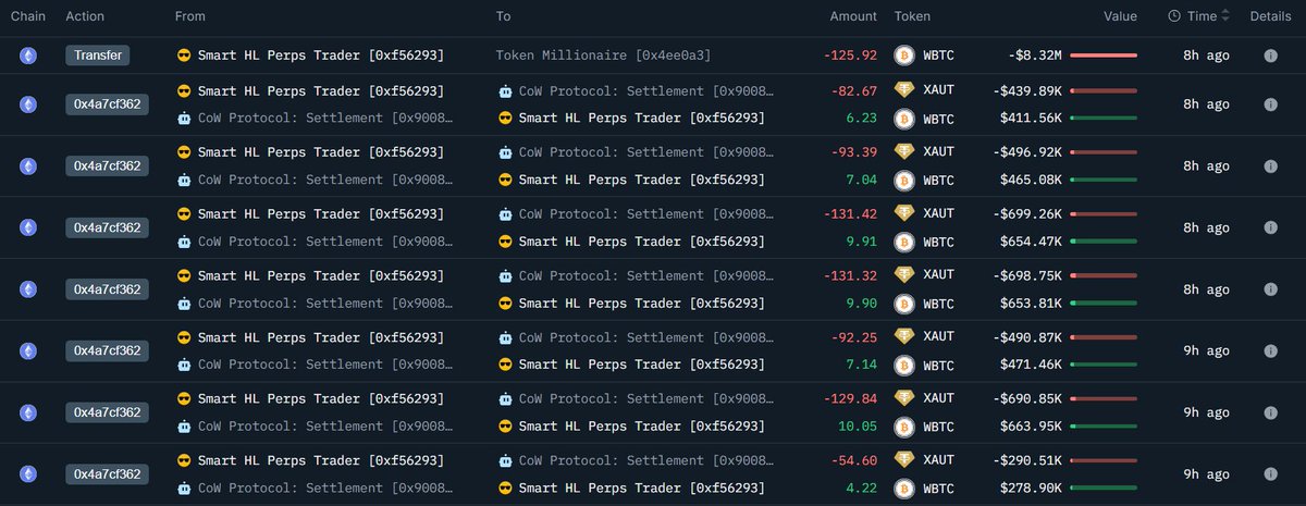 巨鲸地址再度大举购入XAUT 根据链上分析账户披露,某巨鲸地址再次进行了大量XAUT的买入操作。该地址以每枚5140美元的价格购入了1733枚XAUT,涉及资金规模约达883万美元。 该地址在四天前曾出售其持有的XAUT并转换为WBTC,而此番交易则显示其重新增加了XAUT的持仓比重...