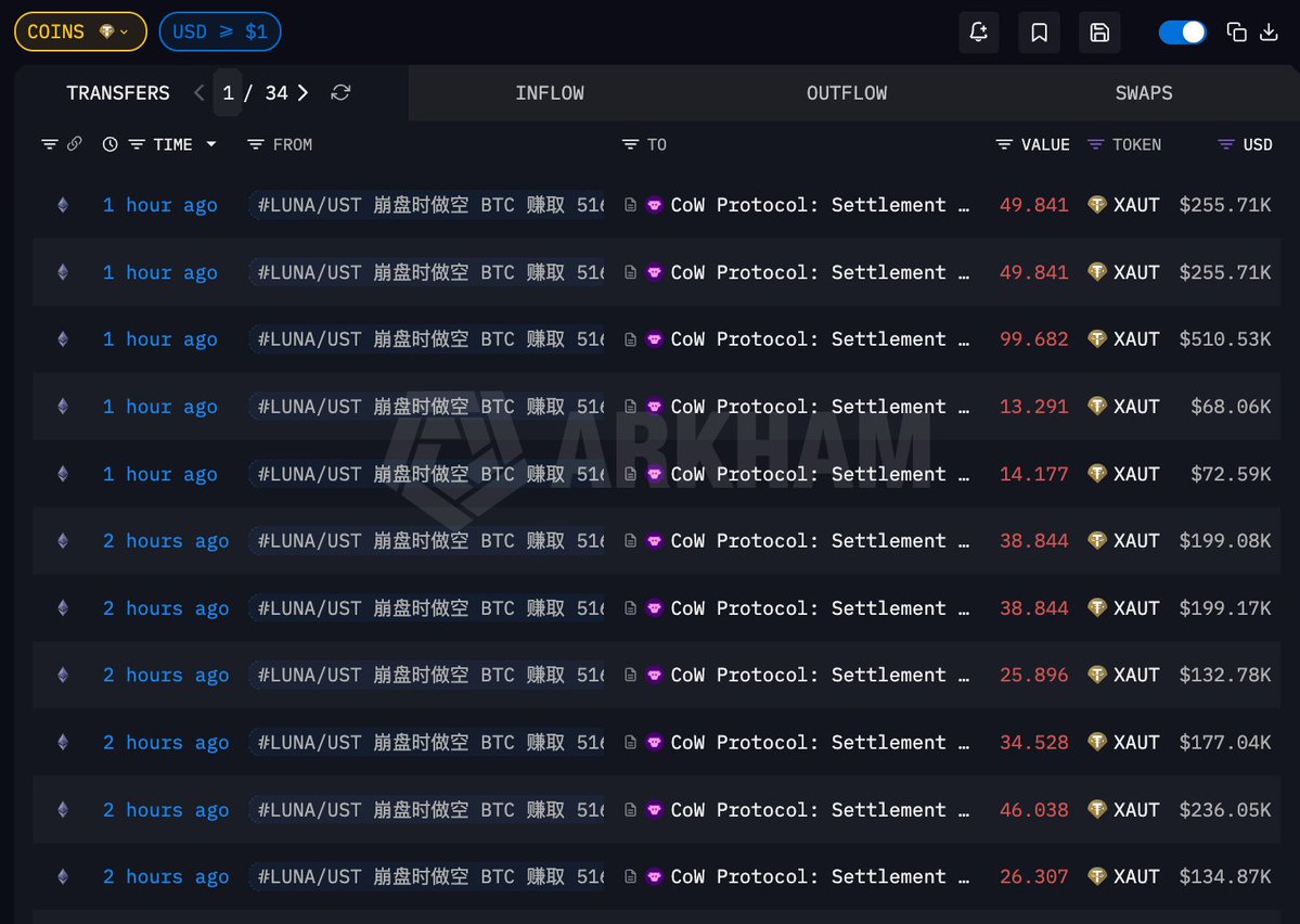 鲸鱼再次买入1,733个XAUT……规模约883万美元
