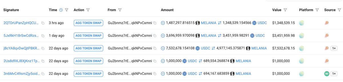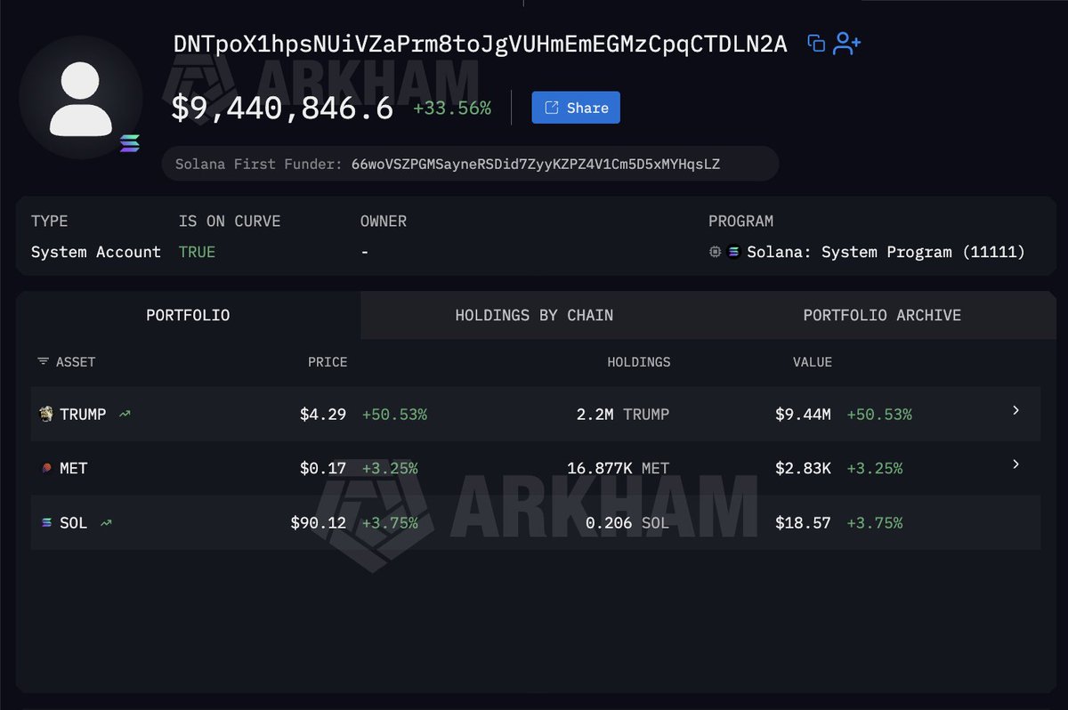 • 在 Solana 上,他花了5,346 $SOL(107万美元)以6.45美元的价格买了165,401 $TRUMP(140万美元),未实现利润为33.5万美元。