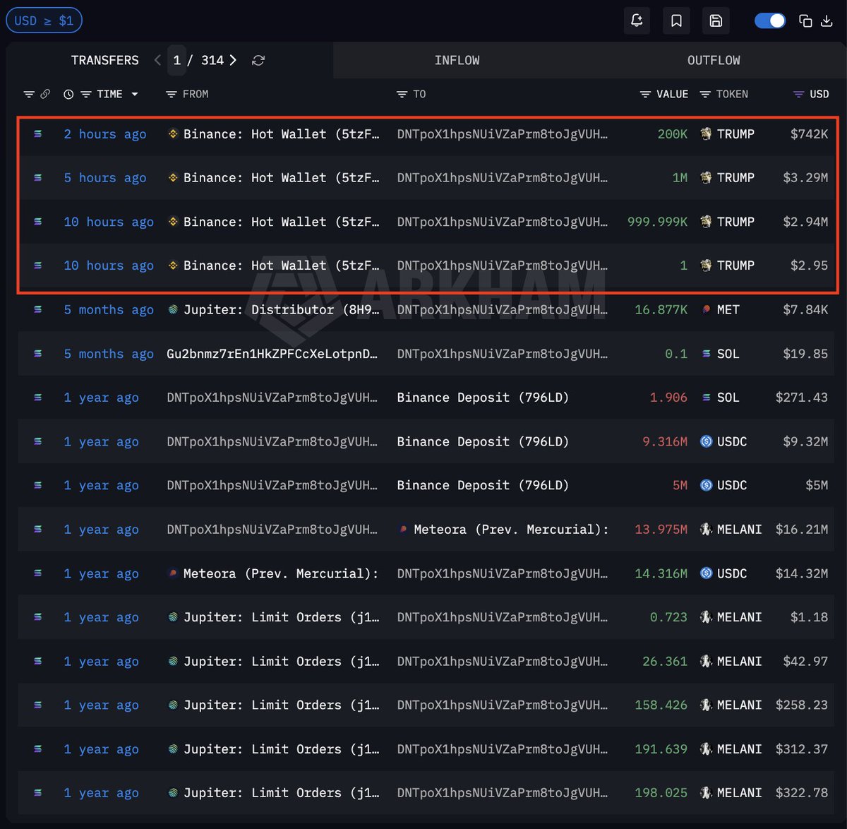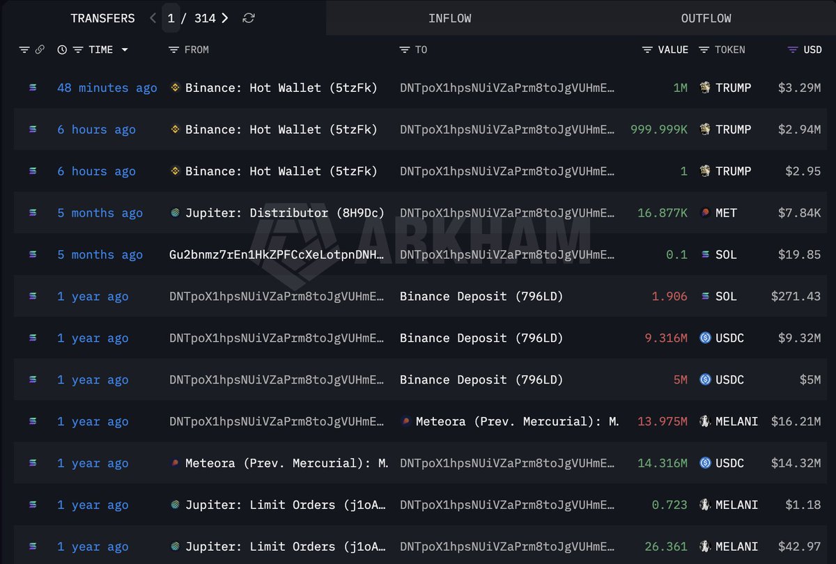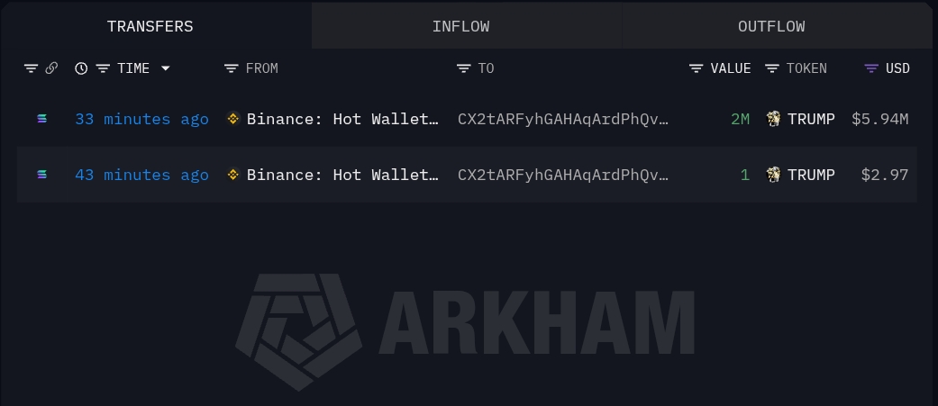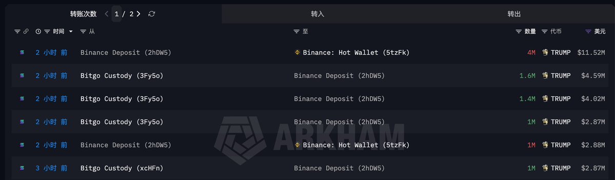 而 2 月初解锁转出的 TRUMP 里有 988 万枚 ($3170 万) 已经陆续进入了 Binance。