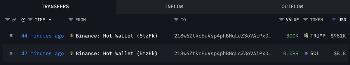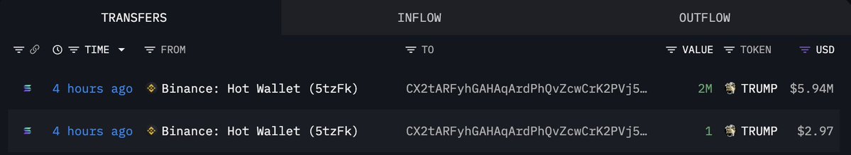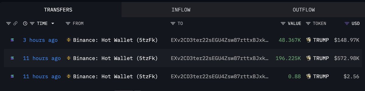 过去12小时内,3个新创建的钱包从#Binance提取了254万$TRUMP(880万美元)。