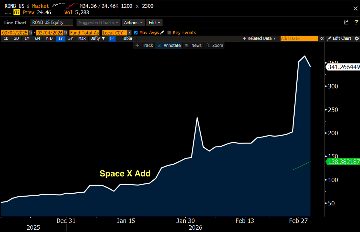 $RONB 自上周五加入大量 SpaceX 后迅速吸收了 $32m.. 这意味着资产在两天内有机增长了33%。也就是说,SpaceX 权重如预期般稀释,从22%降至19%。