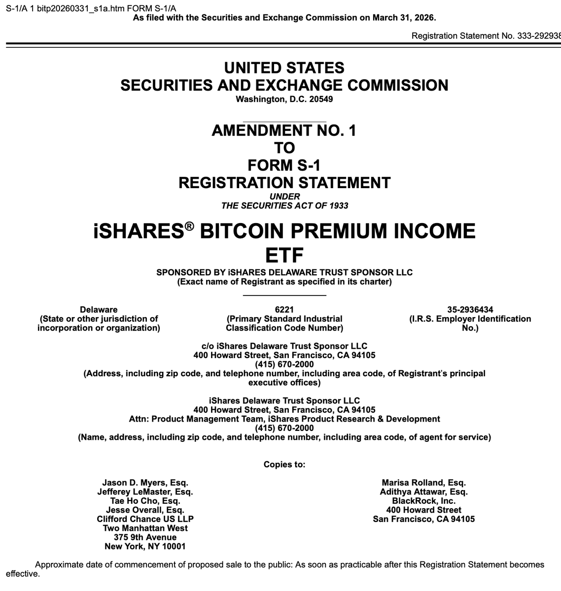 贝莱德刚刚修改了其iShares比特币溢价收入ETF($BITA)的S-1文件。