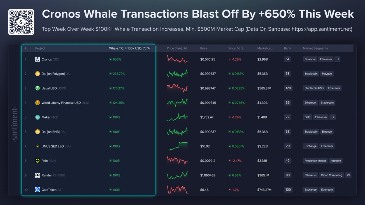 🐳 1) @cronosapp $CRO +650% 鲸鱼交易增长