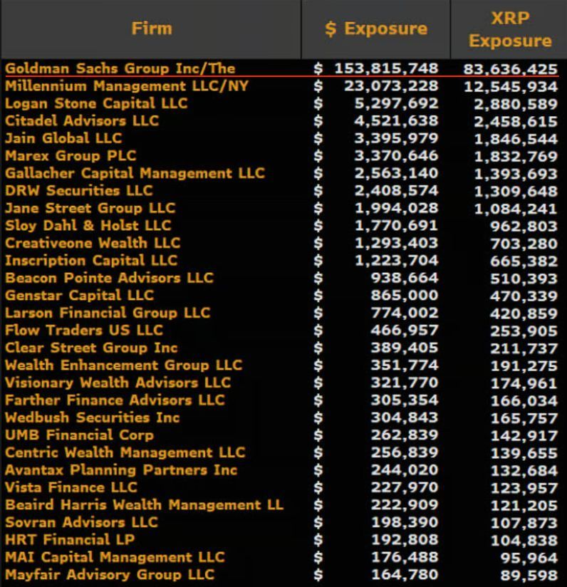 2025年第四季度的SEC文件显示,高盛是现货XRP ETF的主要持有者,资产规模高达1.538亿美元。前30大持有者管理的资产总额为2.11亿美元,而自2025年11月推出以来,总流入资金已飙升至10亿美元以上。