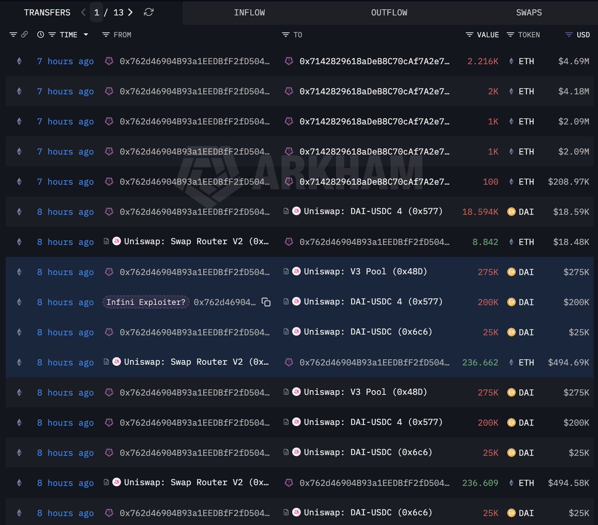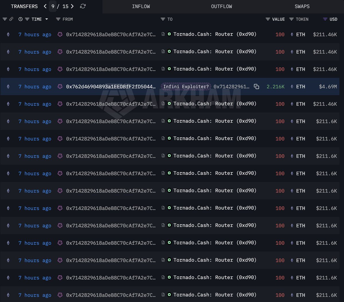 攻击者立即将USDT兑换为DAI,再兑换为ETH,大部分资金最终存入了@TornadoCash。