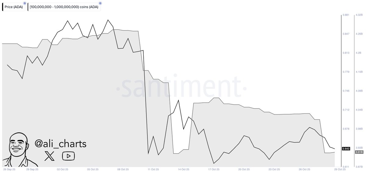 卡尔达诺跌破关键均线 释放强烈看跌信号 ADA价格已跌破50日、100日和200日移动均线,显示强劲的下跌趋势。链上数据显示,巨鲸正将数百万枚ADA从交易所转移至私人钱包,流出量持续增加。值得注意的是,过去60天内新增超过10万个ADA钱包,表明网络参与度正在提升。 技术指标显示超卖风险 卡尔达诺(ADA)过去24小时下跌5.4%,现报0.5766美元。日线图上,ADA价格已跌破所有关键均线。ADA/USDT日线图来源:TradingView 相对强弱指数(RSI)目前处于33.23,虽然显示接近超卖区域,但动量指标仍然疲软。若持续下跌,价格可能触及下降平行通道下轨,当前该支撑位位于0.4...