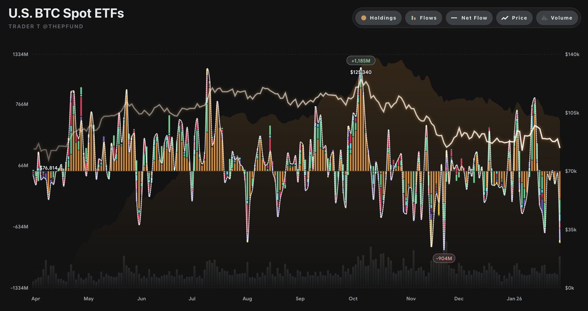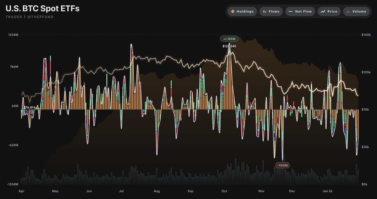 比特币现货ETF资金流向引关注 截至1月30日(美国东部时间),比特币现货ETF当日录得5.1亿美元的资金净流出,这已是连续第四个交易日出现资金净流出的态势。 资金流入端表现分化 数据显示,当日资金净流入最多的ETF为Ark Invest与21Shares联合推出的ARKB,单日流入834万美元,其累计净流入已达14.83亿美元。资金净流入规模次之的为富达旗下的FBTC,单日流入729万美元,累计流入规模约为112.73亿美元。 主要产品现显著流出 另一方面,贝莱德旗下的IBIT当日出现5.28亿美元的大额净流出,成为流出规模最大的产品。目前,IBIT的累计净流入额约为619.56亿美元。 市...