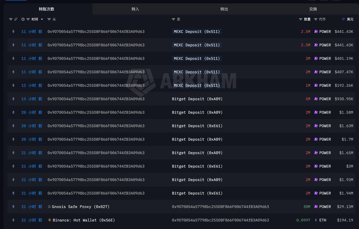◎3000 万枚 POWER 在昨晚 11 点至今早 9 点期间从团队关联多签钱包 0x027A...cd6c 转出进入 Bitget 与 MEXC:其中 2000 万枚进入 Bitget、1000 万枚进入 MEXC。