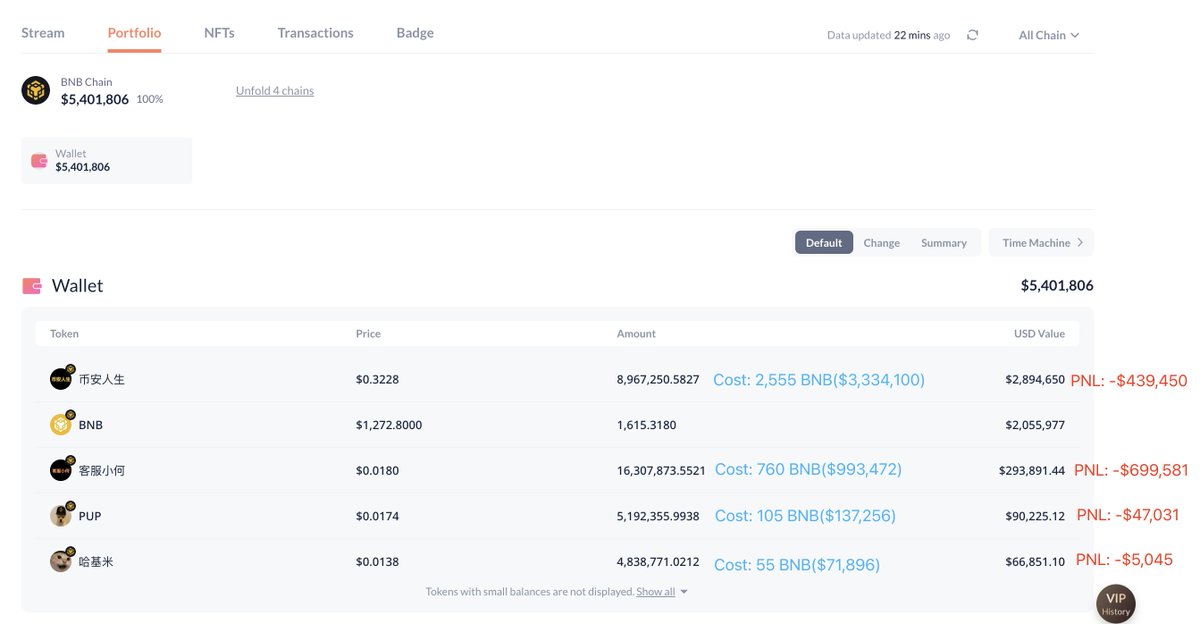 • 花费760 $BNB($993K)购买了16.31M $客服小何,亏损$700K