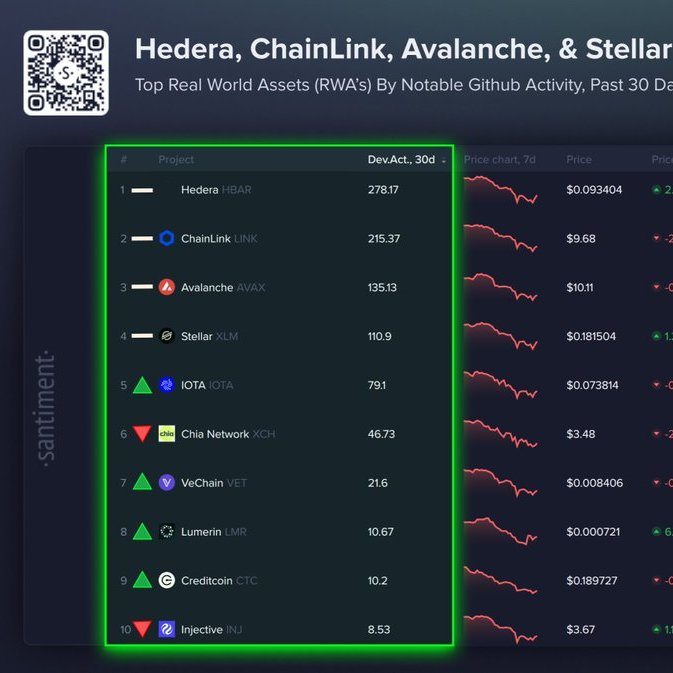 熊市中的亮点:Hedera成为RWA领域开发最活跃的公链 尽管市场整体疲软,Hedera在加密数字货币实物资产领域脱颖而出,被认定为开发活跃度最高的区块链网络,受到广泛关注。 区块链数据分析公司Santiment近日公布了RWA领域最近30天内开发活动最活跃的前十大区块链。其中,Hedera以278.17分位居榜首。Chainlink、Avalanche、Stellar Lumens、IOTA等紧随其后。 Hedera是一个基于权益证明机制的公共网络,据评估其每秒可处理超过10,000笔交易,具备适合去中心化应用和RWA运营的性能。该网络正通过加强与伦敦证券交易所旗下RWA平台Archax、房...