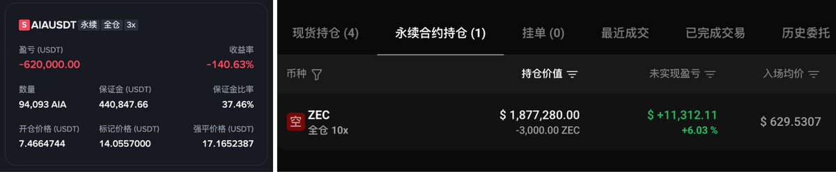 既 COAI 后再次做空 AIA,目前持仓 94,093 枚,开仓价格 $7.46,已浮亏 62 万美元,回报率 -138.88%