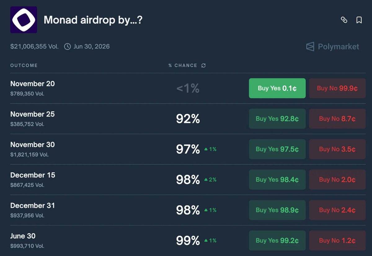 Polymarket 上关于「Monad 何时空投」的押注,最近的日期是 11.25,最远也不过是 01.30