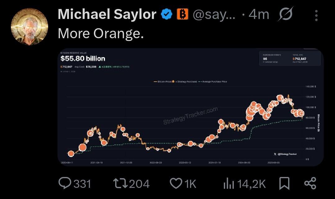 迈克尔·塞勒的策略 比特币收购操作正在其成本基础附近运行,但并未面临强制清算。2026年2月1日,在比特币下跌超过13%后,迈克尔·塞勒发布了“更多橙色”,确认了本年度第五次比特币收购。该公司目前持有712,647枚比特币,平均成本为76,037美元,而比特币在短暂跌至75,200–75,500美元区间后,交易价格接近78,000美元。由于其债务是无担保且长期的,公司的杠杆结构保持稳定。大部分债务义务在2027–2028年之前无法强制执行,因此即使比特币价格低于成本价,也不存在保证金追缴风险。公司拥有22.5亿美元的现金储备,在现行条件下足以覆盖至少2.5年的股息和利息支付。 迈克尔·塞勒的“...