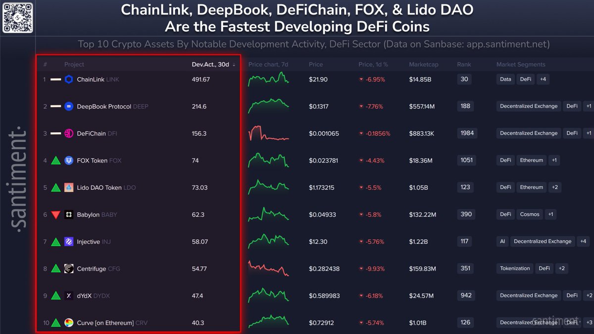 市场波动加剧,但"十月行情"预期升温 尽管美国政府停摆给市场蒙上阴影,波动性仍居高不下,但交易员们对季节性看涨周期"Uptober"(十月上涨行情)的期待正在增强。当投资者争论比特币会否引领下一轮涨势时,真正的行动正在幕后悄然展开——在代码的世界里。 链上数据揭示DeFi建设者排名 区块链分析公司Santiment最新数据显示,Chainlink(LINK)在活跃开发指标上超越所有DeFi项目,再次证明即使在动荡市场中,开发动能比每日价格波动更具意义。这份榜单中,DeepBook Protocol(DEEP)和DeFiChain(DFI)分别位列第二、三位。 风暴中的建设者梯队 过去数周的...