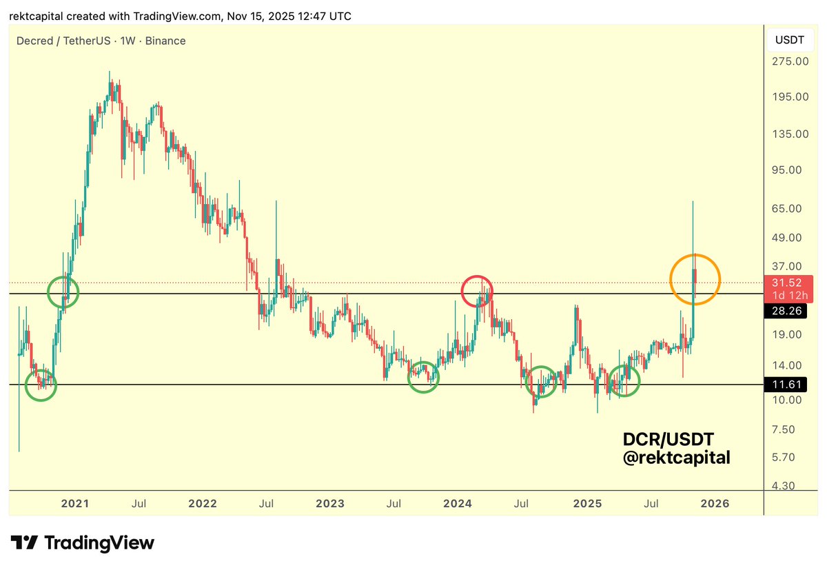 加密市场整体承压 少数代币展现韧性 在以太坊(ETH)近30日跌幅扩大至24%以上的背景下,更广泛的加密货币市场持续低迷。尽管多数主流代币面临压力,但仍有部分加密货币展现出强劲抗跌性,Decred(DCR)便是其中之一。 今日DCR上涨5%,使其月累计涨幅突破100%。当前图表显示的技术形态表明,该代币可能正在酝酿更大级别的行情。 对称三角形态酝酿中 从4小时图观察,DCR正在对称三角形内震荡整理——这种形态往往出现在爆发性突破前的蓄力阶段,反映买卖力量趋于平衡,波动率持续收缩直至选择方向。 图表显示DCR近期从31.13美元支撑位反弹,短暂回调后买盘再度介入。这波回升将价格推高至33....