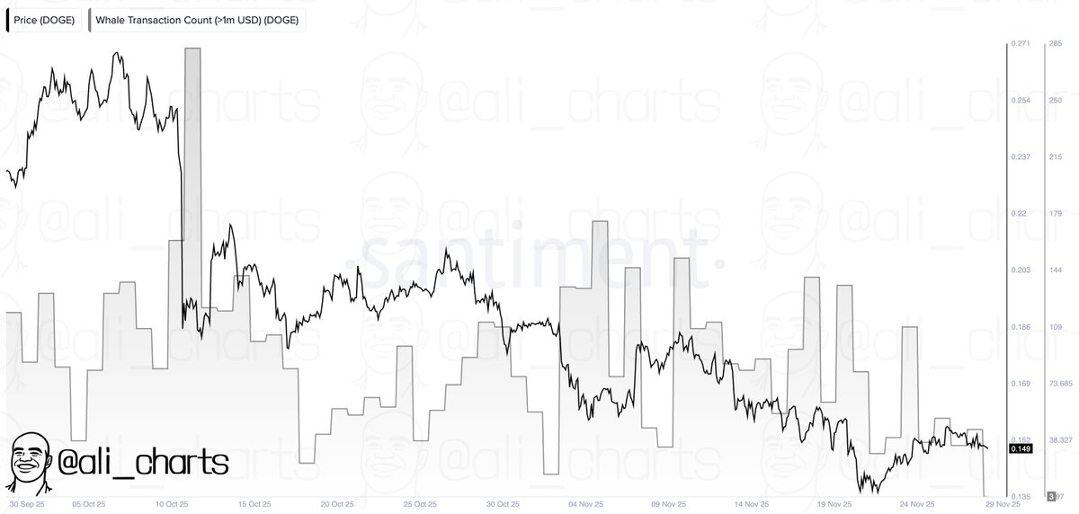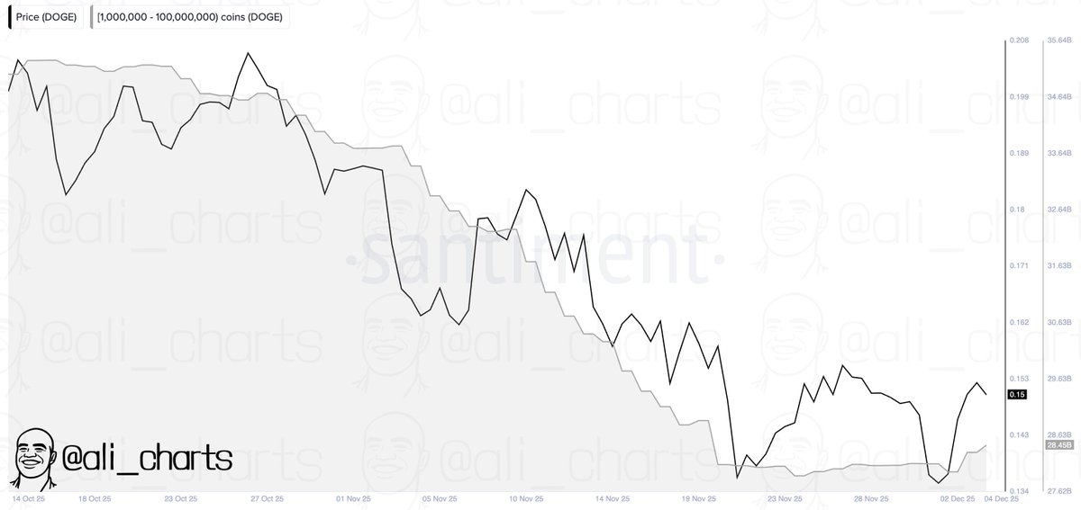 巨鲸48小时内购入4.8亿枚DOGE,后市将如何演变? 随着巨鲸活动急剧增加,狗狗币(DOGE)再度成为市场焦点。在这款经典 meme 币获得用户与机构日益青睐之际,持仓模式正悄然转变。 大额持有者逢低吸纳 分析师阿里·马丁内斯援引Santiment数据显示,在12月2日至4日期间,持仓量在100万至1亿枚DOGE之间的钱包地址总计增持约4.8亿枚代币。这使得巨鲸总持仓在短短两日内从约280亿枚攀升至284.8亿枚。 此次增持恰逢狗狗币从近期低点0.14美元反弹至0.15美元。过去24小时DOGE下跌2%,周跌幅同样为2%。吸筹时机表明大资金选择在局部底部区域入场。 正如CryptoPotat...