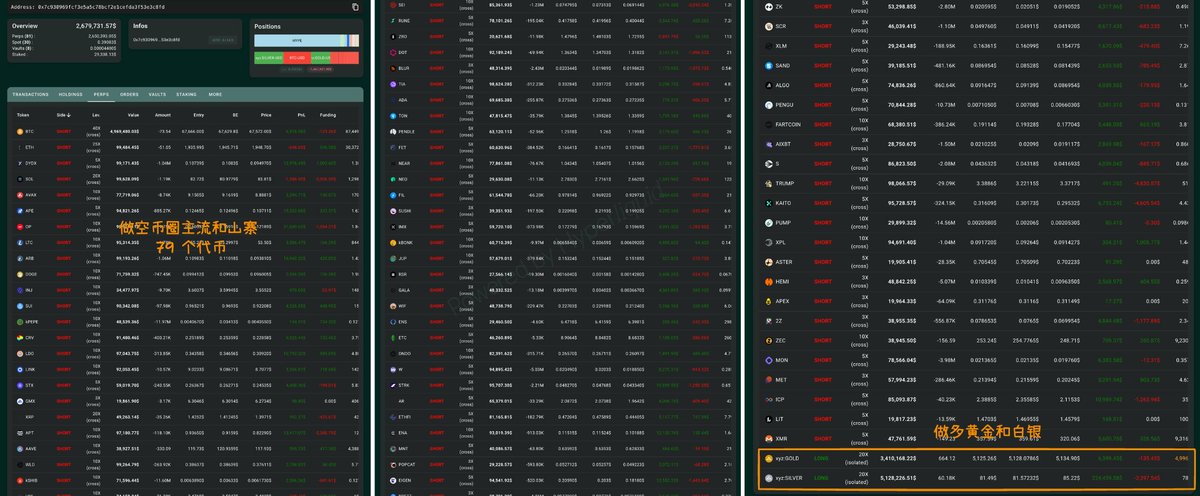 地址持仓动态 根据链上分析师Ai Yi的数据,地址0x7c9…3c8fd在衍生品交易所Hyperliquid上持有总计约264.7万美元的仓位。该地址同时操作两个黄金与白银的多头仓位,以及九个针对BTC、ETH、SOL、DYDX、AVAX等主流及山寨币的空头仓位。 盈亏状况分析 目前除ETH与SOL仓位外,该地址在其他持仓中实现未兑现盈利约57.3万美元;ETH与SOL仓位则分别产生约1000美元水平的未兑现亏损。其余代币相关仓位均维持在入场价之上的盈利区间。 市场行为解读 这一数据反映出,在近期市场对黄金白银等安全资产偏好上升的背景下,部分交易者正扩大对主要加密货币的下跌押注...
