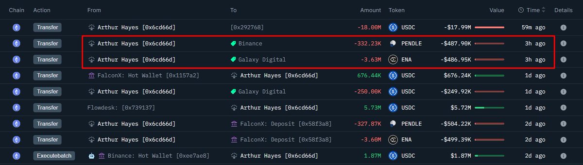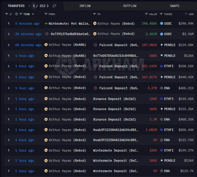 Arthur Hayes将价值百万美元的Pendle与Ethena转移至FalconX