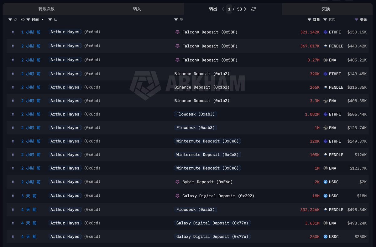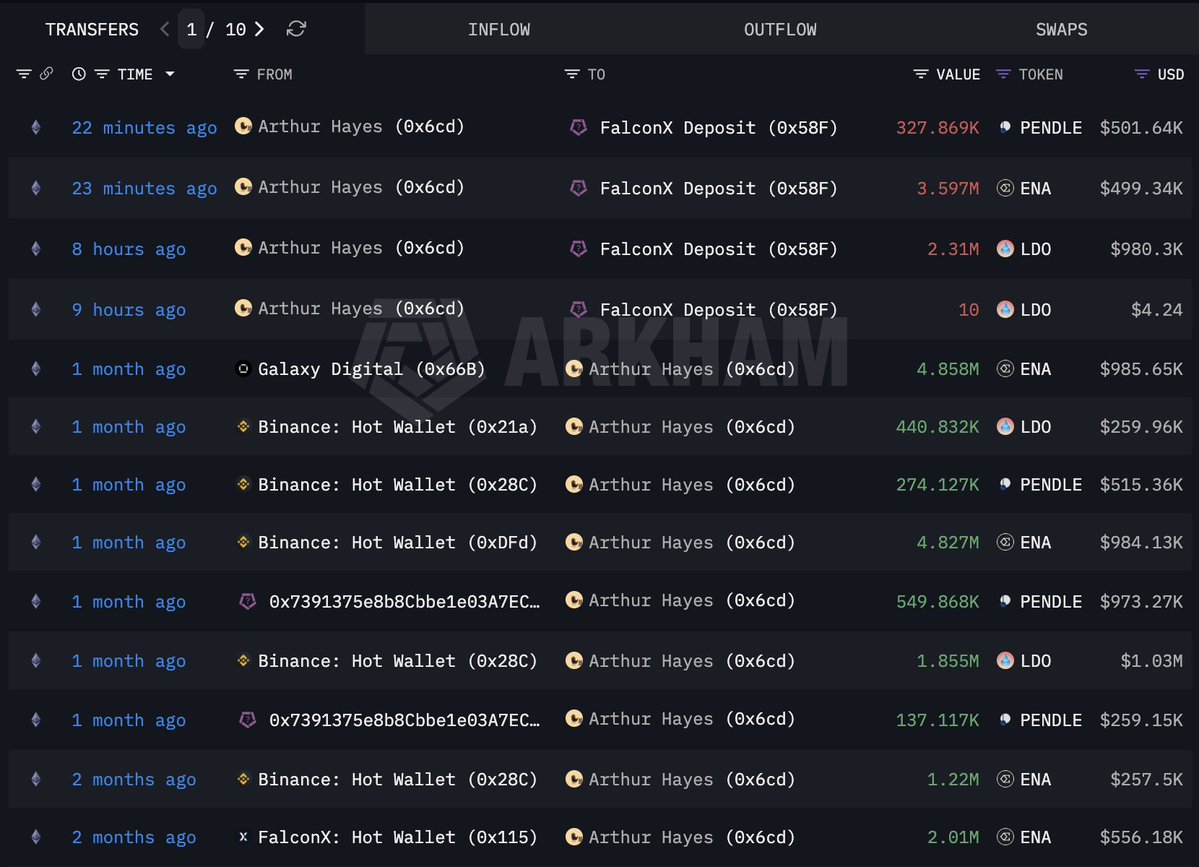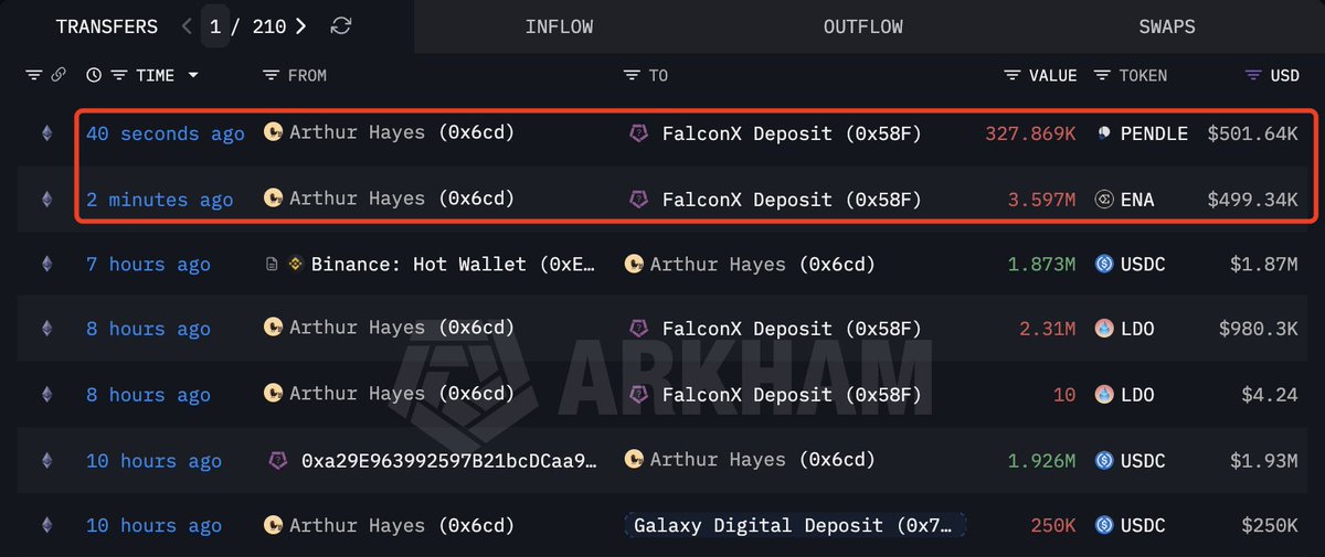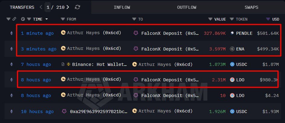 Arthur Hayes向FalconX转移价值198万美元的ENA、PENDLE和LDO
