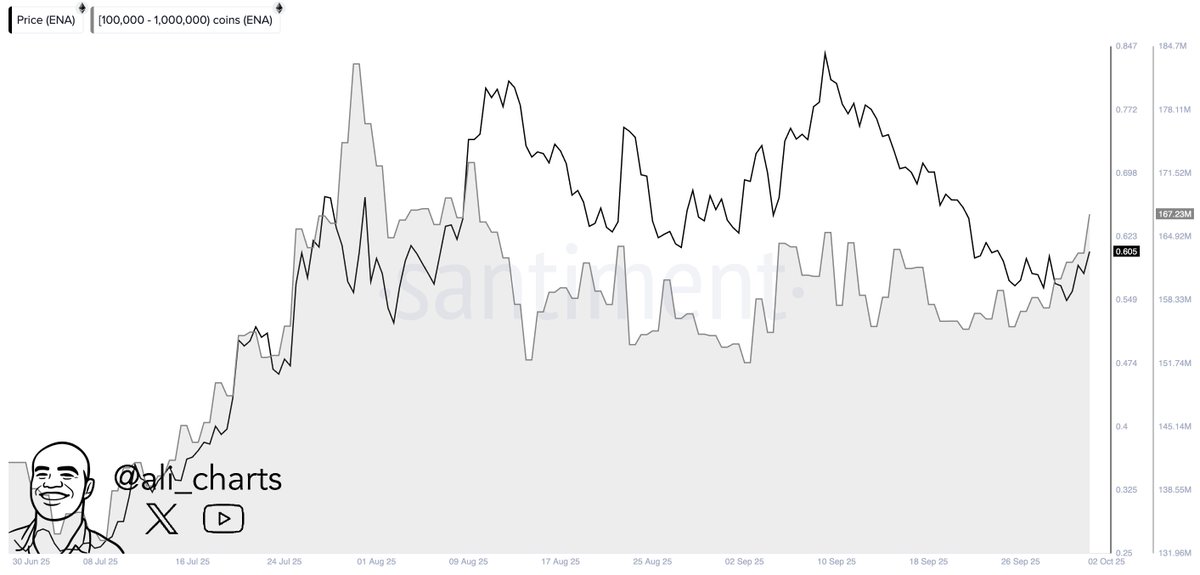 Sui与Ethena合作引发市场热潮 Sui(SUI)与Ethena(ENA)的战略合作持续点燃市场热情。双方推出的合成美元产品suiUSDe专为DeFi生态设计,配合显著的投资者持仓增长,预示着价格突破的可能性正在加大。 巨鲸持仓与资金流向 过去一周,巨鲸地址累计增持1200万枚ENA代币,显示出市场对Ethena项目韧性的信心。与此同时,Sui交易所净流出达1135万美元,表明持仓积累趋势明显,抛压正在减弱。 ENA价格目标与技术形态 ENA在0.55美元需求区完成筑底反弹后,上方目标位分别位于0.70美元、0.85美元和1.00美元关口。若能在成交量配合下有效突破0.70美元阻力位...