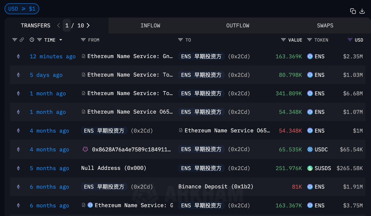 加密货币分析师Ai姨(@ai_9684xtpa)披露ENS早期投资者动态 据监测,疑似以太坊域名服务(ENS)早期投资者的钱包地址(0x2Cd...5c422)于约12分钟前从ENS多重签名钱包再次接收16.3万枚ENS代币(约合235万美元)。该地址自9月30日以来累计接收价值1112万美元的ENS代币,截至目前相关资产仍保持未转移或出售状态。 历史资金动向分析 链上记录显示,该地址曾在接收代币数月后将部分代币转移至币安交易所,最近一次类似操作发生在六个月前...