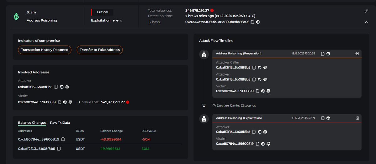匿名交易员遭遇地址投毒攻击,损失5000万美元 一名匿名加密货币交易员遭遇地址投毒骗局,据报损失高达5000万USDT。该交易员从币安提取资金时,误将资产转入伪造地址。此类攻击通过粉尘交易模仿合法地址的首尾字符,诈骗者利用这一手段针对大额持仓用户进行欺诈。 被盗资金迅速转换与转移 本次事件造成严重经济损失,5000万USDT被立即转换为DAI,继而兑换为16,690枚ETH。资金转换通过MetaMask Swap完成,后续清洗流程经由Tornado Cash处理。 高余额钱包成重点目标 地址投毒攻击已累计造成超过8300万美元损失。安全专家建议采取地址白名单、多重签名钱包等防护策略,并强调...