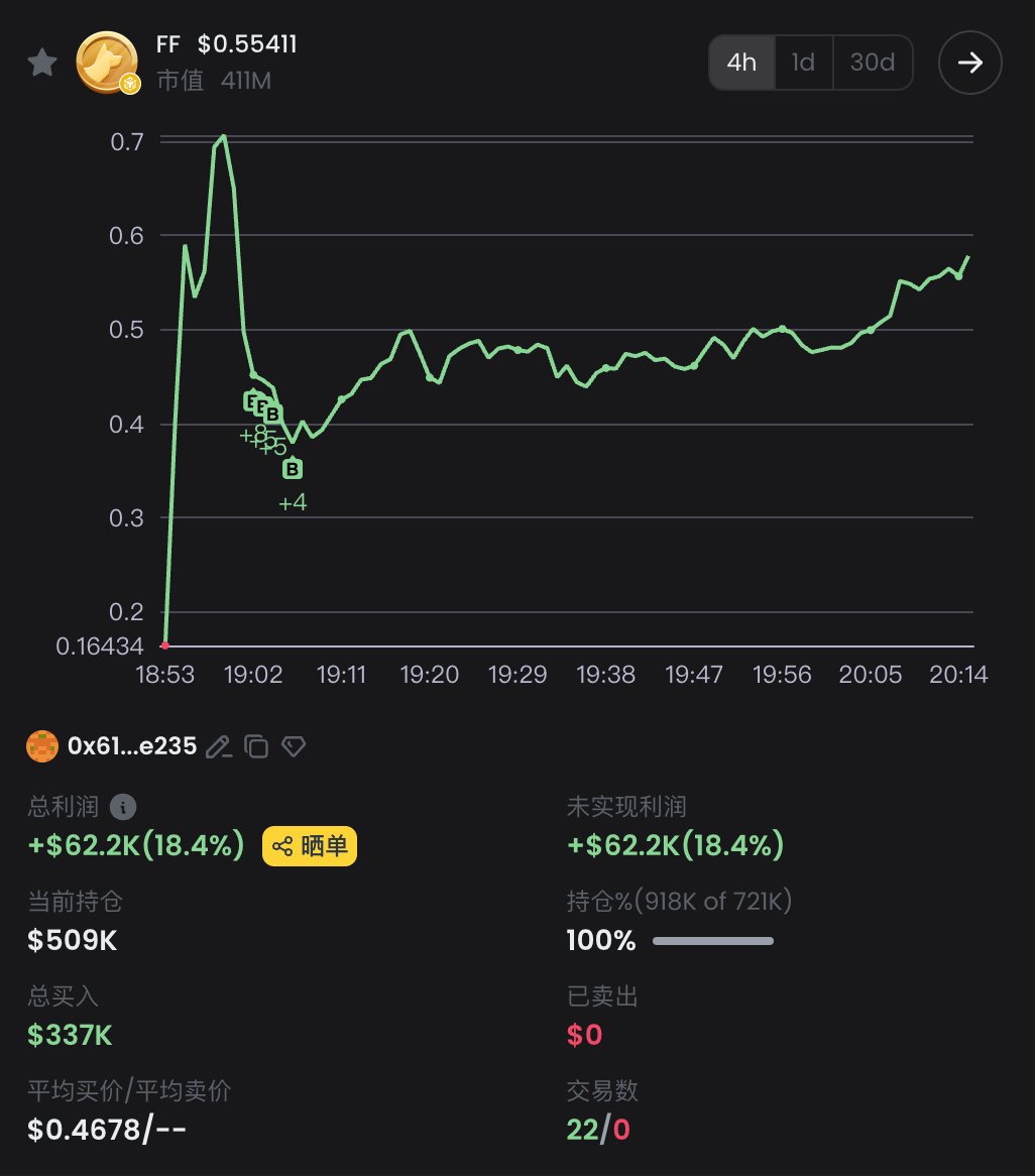 新币真是集体突突,按链上现价算 $FF FDV 57 亿了 地址 0x61D...9e235 在 BSC 网络花费 33.7 万美元买入 FF,均价 $0.4678,目前已浮盈 6.2 万美元;他起初将 FF 和 USDT 添加进 Pancake 组了双边流动性,吃了会手续费又提出来,不知道是不是在等开盘了