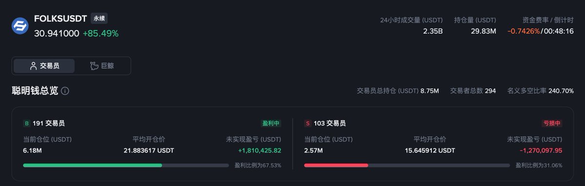 FOLKS期货交易量创新高 根据链上分析师Ai的数据,FOLKS的24小时期货交易量已达到23.5亿美元,在除比特币和以太坊之外的虚拟资产中位居首位。目前未平仓合约金额为2983万美元。 多空持仓情况分析 交易数据显示,约65%(191个)的大户投资账户选择了FOLKS期货多头仓位,总多头规模达618万美元,平均建仓价格为21.88美元。另一方面,约35%(103个)的账户持有空头仓位,总规模为257万美元,平均建仓价格为15.64美元,这表明多数空头投资者维持在低位卖出的策略...