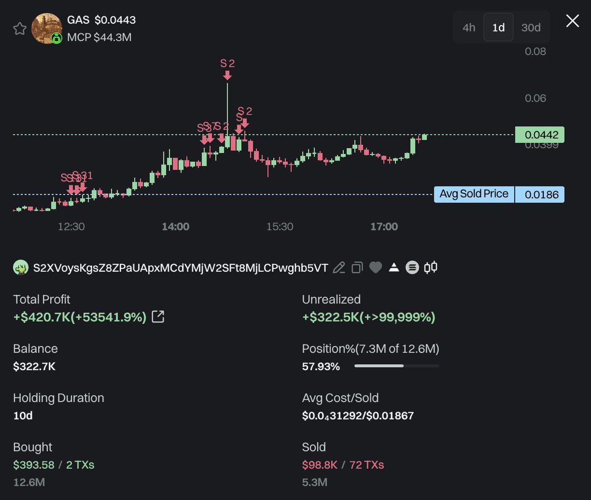 交易员S2XVoy花费394美元购买了1260万$GAS,卖出530万$GAS获得9.88万美元,仍持有730万$GAS(价值32.25万美元)。