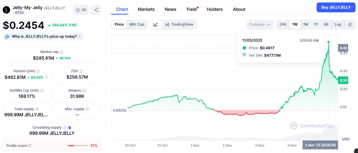 最大供应市值$2450.69万当前供应量999,999,099 JELLYJELLY