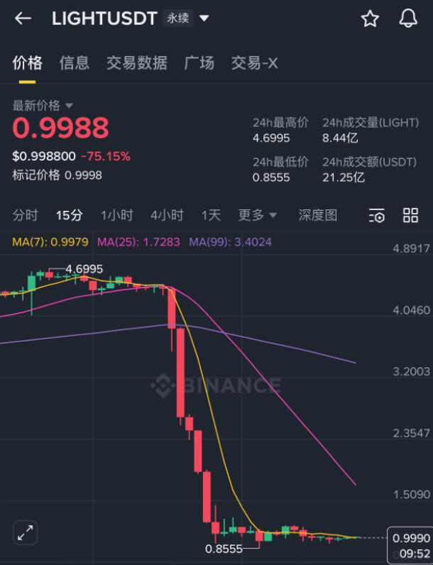 加密货币LIGHT五小时半内暴跌77%,24小时交易额达21亿美元