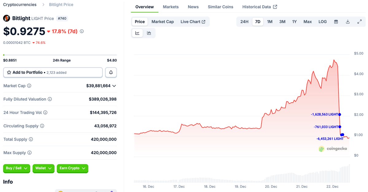 Bitlight价格暴跌:$LIGHT单日重挫74%背后原因解析
