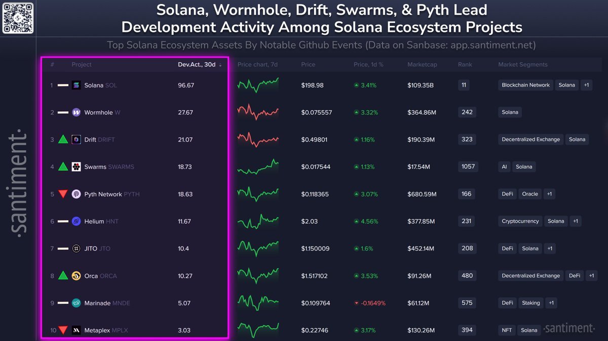 Solana生态开发者活动激增:Wormhole与Drift引领发展浪潮 Santiment最新数据显示,Solana生态系统开发者活动呈现加速态势,10月份多个头部项目增长显著。该机构通过增强版GitHub事件追踪系统,从开发进度维度评选出十大Solana生态项目,涵盖基础设施、DeFi和跨链协议等推动网络发展的核心领域。 头部项目保持技术领先 Solana($SOL)稳居榜首,其网络持续扩张的吞吐量与性能升级巩固了主导地位。Wormhole($W)和Drift Protocol($DRIFT)分列二三位,两者因跨链集成与去中心化交易创新获得开发者高度参与。 数据基础设施展现实力 Swa...
