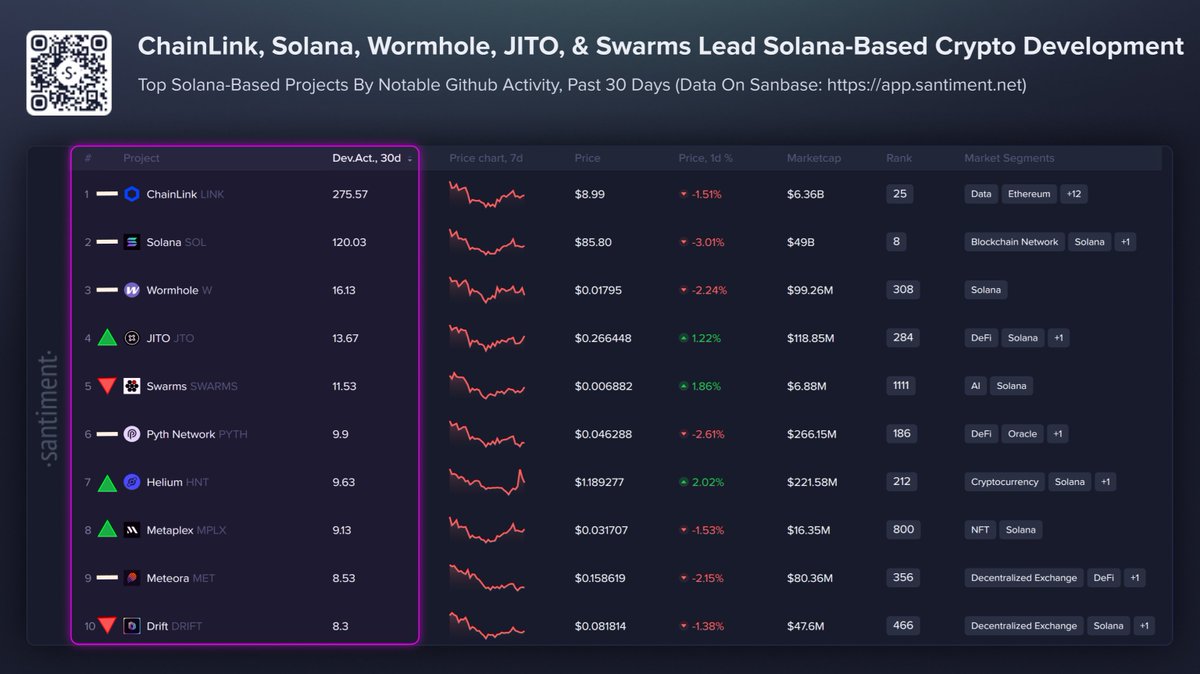 Solana生态内部出现了一个微妙却值得关注的转变,但这并非体现在价格走势上,而是体现在开发者的行为中。Santiment汇总的近期GitHub活动数据将数个基础设施密集型项目置于该网络开发排名的前列,这表明即便在市场行情波动之际,幕后的技术工作依然活跃。Solana生态系统内的开发领导者根据Santiment汇总过去30天GitHub活动的数据,Chainlink ($LINK) 以275.57的得分位居所有Solana相关项目开发活动之首。尽管Chainlink通常与以太坊生态紧密关联,但其跨链基础设施在Solana的集成和数据供给中扮演着重要角色。Solana ($SOL) 本身以120...