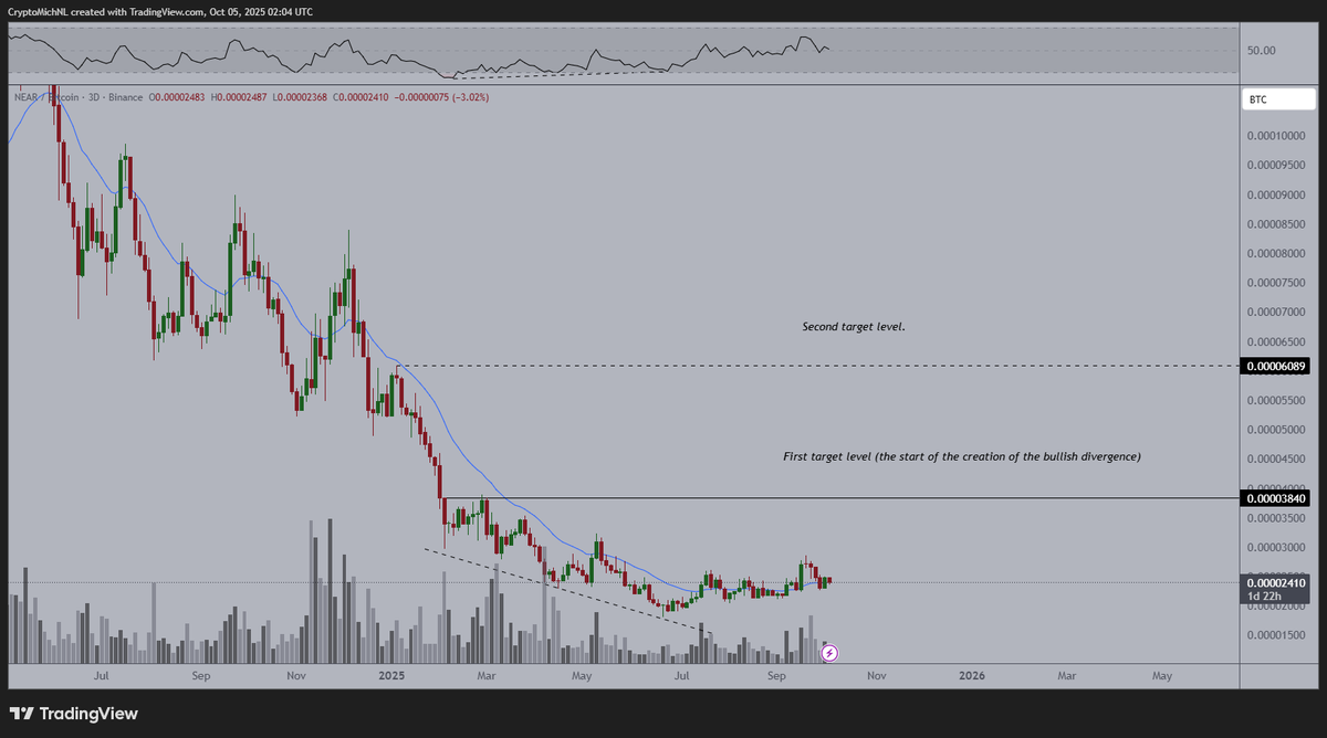 加密货币市场走强,比特币和以太坊周涨幅超13% 2025年10月5日 GMT+8 上午6:54 随着比特币(BTC)和以太坊(ETH)过去7天涨幅均超过13%,加密货币市场显现强劲势头。比特币今日更创下12.5万美元的历史新高。在此行情带动下,多个山寨币开始呈现看涨态势——其中Near协议(NEAR)表现尤为突出。NEAR本周已上涨15%,当前技术形态暗示可能即将出现重大趋势反转。 圆弧底形态正在形成 日线图上,NEAR似乎正在构筑圆弧底形态——这种看涨反转结构通常出现在长期下跌趋势后,标志着市场情绪正从低位吸筹逐渐转向买方力量复苏。该形态始于2025年2月,当时NEAR在3.37美元区域...