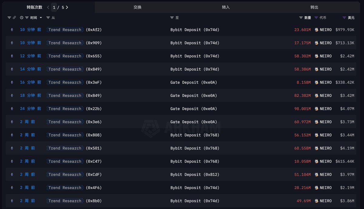 Trend Research 今天已经把三分之一总量的 $NEIROETH 转进了交易所。 他们除了在继续向 Bybit 转移 NEIROETH ,也开始把 NEIROETH 转进 Gate。 他们今天已经把差不多一半的持仓转进交易所了:之前一共是持仓 6.7 亿枚 (67% 总量),今天已经转进交易所 3.247 亿枚 $NEIROETH ($2200 万)。 链上地址则还持有总量 34.6% 的 NEIROETH (3.46 亿,价值 $2316 万)。