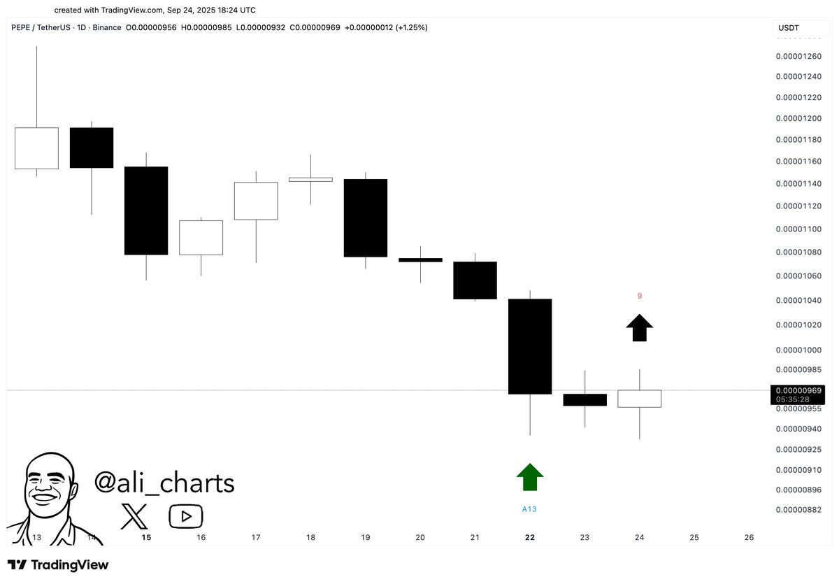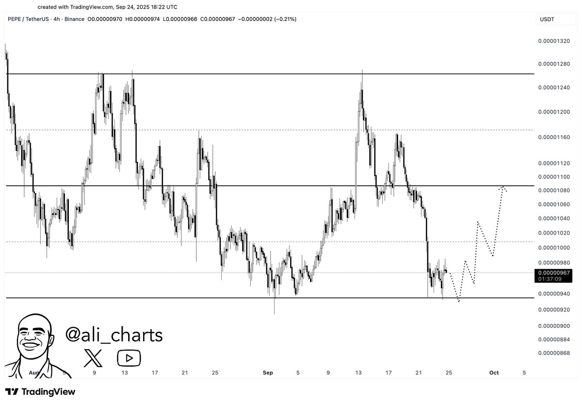 PEPE确认上涨趋势 4小时图表显示,PEPE已突破伴随高成交量和均线支撑的对称三角形形态。价格稳定在0.0000100上方强化了短期看涨控制,上行目标设定为0.0000106和0.0000108。 交易量增长25%至6.83亿美元,看涨情绪指数达87,表明市场参与度和信心处于高位。 技术结构与突破区域 PEPE/USDT的对称三角形反映了价格在决定性突破前的紧缩阶段。突破蜡烛伴随成交量放大,确认这是市场驱动而非投机行为。 当前PEPE位于9周期指数移动平均线(EMA)和50周期简单移动平均线(SMA)上方,这种均线排列在过去模因币行情中往往预示更强劲的价格增长。关键跟踪位是0.000010...