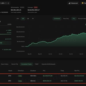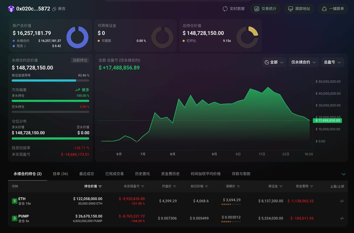 麻吉大哥黄立成 (@machibigbrother) 目前在 Hyperliquid 上价值 $1.49 亿的 $ETH 及 $PUMP 多单目前浮亏高达 $1868 万。 ◎$4,399 做多了 3 万枚 $ETH ($1.22 亿),目前浮亏 $992 万,清算价在 $3,694; ◎$0.0073 做多了 48.5 亿枚 $PUMP ($2670 万),目前浮亏 $876 万,清算价在 $0.003。