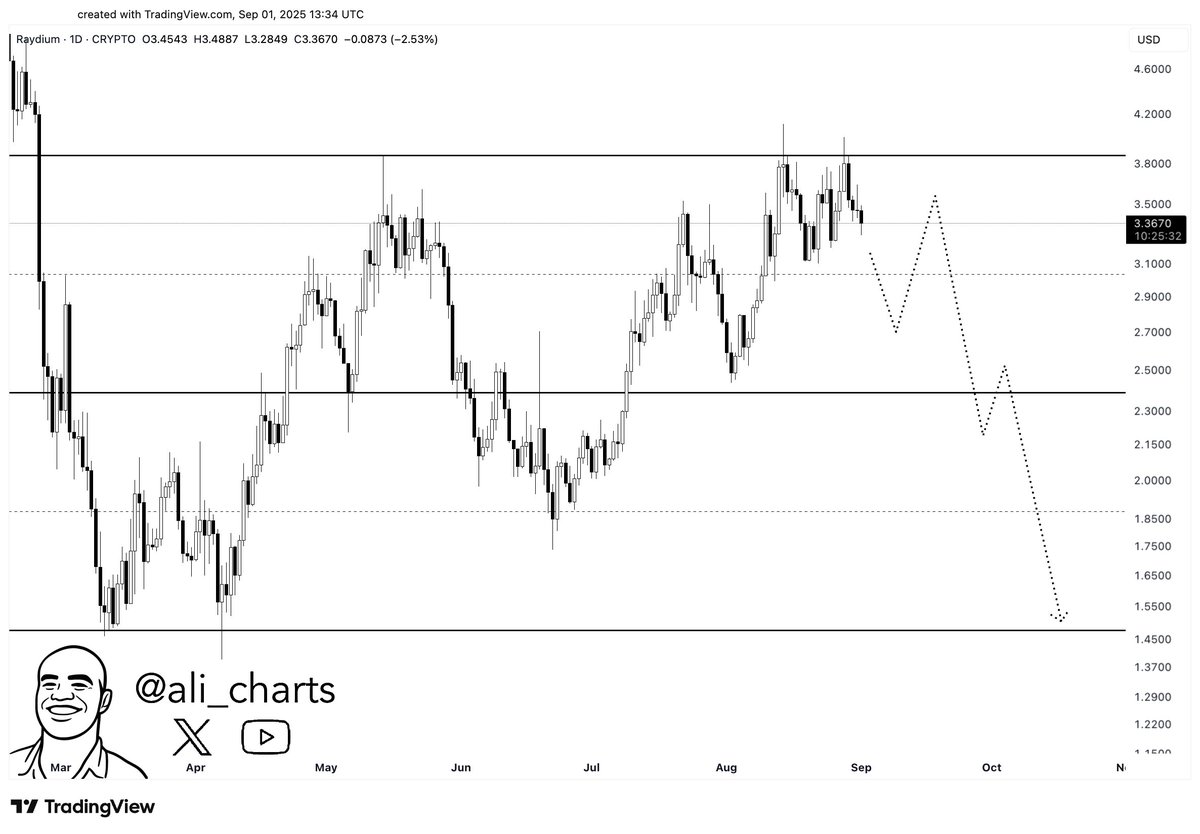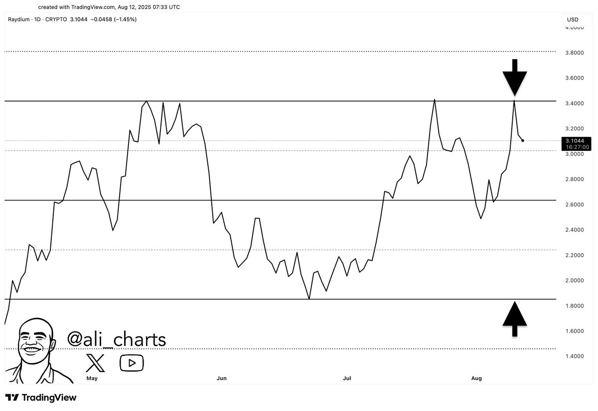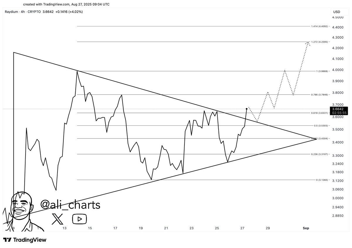 Raydium蓄力区间持续,突破目标指向6.50美元斐波那契延伸位 当前7.85亿美元市值与25.4亿美元总锁仓量(TVL)表明,相对于流通供应动态,RAY存在低估可能。3.80美元附近阻力位仍是关键关卡,需更强成交量方可测试更高价位。 蓄势待发的突破前奏 Raydium(RAY)持续在长达数月的积累区间内震荡。价格结构显示上升趋势线支撑下的低点逐步抬高,表明市场阻力下需求仍受控。分析师Ali(@ali_charts)指出RAY正处于扩张前的盘整状态,3.80美元为预期突破位,6.50美元的技术目标对应1.414斐波那契延伸位,与整体结构吻合。 截至撰稿时,RAY报价2.93美元,接近2....