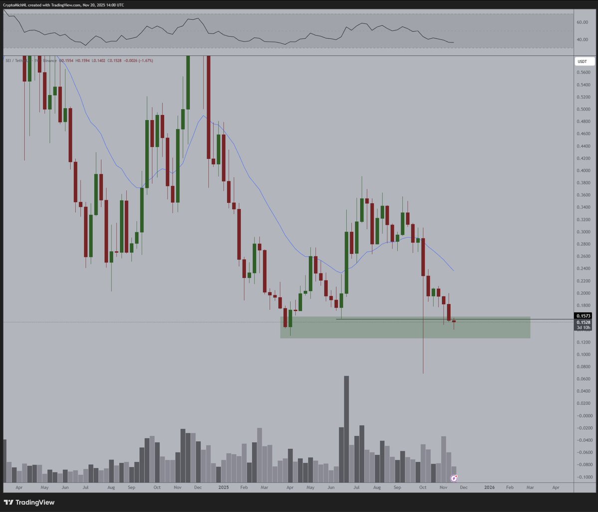 早期市场结构与形态形成 SEI在0.148美元附近交易时显示出潜在的双底形态,同时正在形成更广泛的积累区间。0.35美元附近的颈线仍是关键触发点,任何有效突破都可能为价格打开通往0.70美元目标的路径。 形态与当前价格结构 截至撰稿时,SEI在测试0.1450美元支撑位后交易于0.1488美元附近。图表显示自2024年末以来高点持续下移,压力延续至2025年初。圆弧底部出现在0.135-0.145美元和0.125-0.140美元区间。 颈线位于0.34-0.35美元,是主要结构信号。某公开分析指出这一形态并提及潜在的0.70美元目标位,该观点与技术分析中经典的双底测量方法一致。 技术指标...