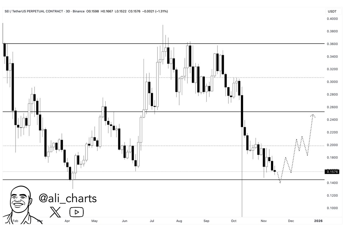核心洞察: 最新SEI加密货币价格预测显示双底形态形成,目标涨幅高达400%。分析师Ali Charts指出颈线位于0.33美元区域,若SEI能有效突破该阻力位,价格或将攀升至0.70美元附近。 过去24小时内,锁仓总价值(TVL)增长6.6%,期货市场衍生品交易量激增20%。 SEI价格预测:双底形态预示变盘 SEI近期价格走势开始引发关注,技术图表显示该代币可能即将结束长期的下跌趋势。在三日图上,SEI正在形成教科书般的双底形态:价格急剧下跌后反弹,再次测试相同支撑区域后开启新一轮上攻。 Ali Charts强调0.33美元颈线位置的关键性,有效突破后价格目标可看至0.70美元,这种目...