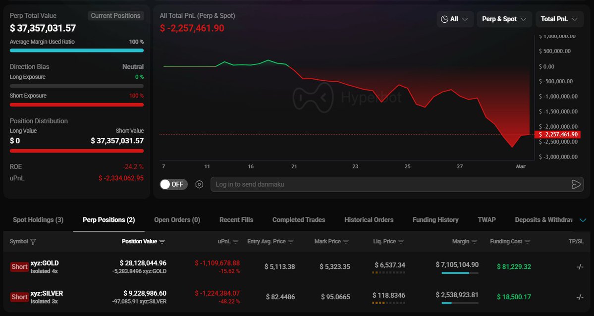 10天前开设#GOLD(4倍)和#SILVER(3倍)空头头寸的鲸鱼"0xaCB"目前浮亏$2.33M。