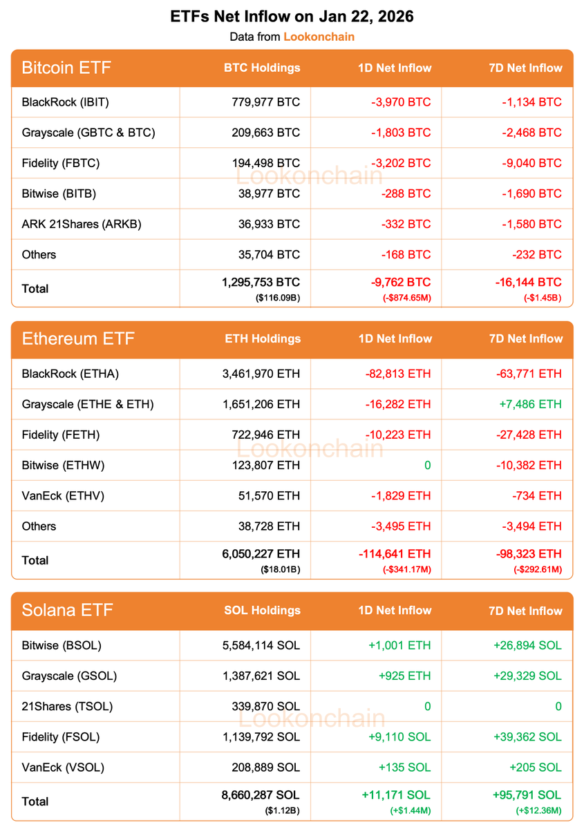 FarSide Investors数据显示,比特币和以太坊交易所交易基金(ETF)出现资金净流出,而Solana与XRP相关产品则获得规模较小但值得关注的资金流入,这表明资金在数字资产内部发生轮动,而非全面撤离。 核心要点 比特币和以太坊ETF均出现资金净流出,显示大型机构短期态度趋于谨慎;Solana和XRP ETF则录得资金净流入,在整体市场盘整中表现突出;尽管ETF遭遇抛售,主要加密货币价格走势保持相对稳定;资金流向数据表明加密市场内部正进行资本轮动,而非全面转向避险。 比特币 1月22日比特币ETF净流出3220万美元,表明机构投资者短期持续保持谨慎。比特币ETF总净流量为负值,反映出...