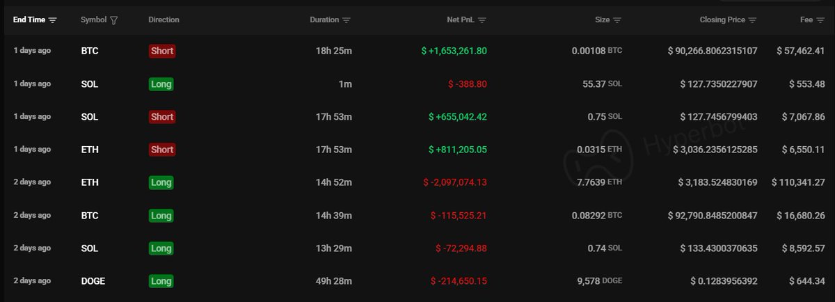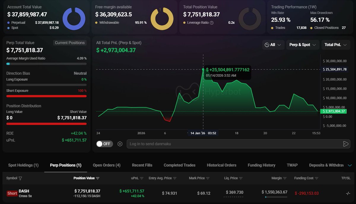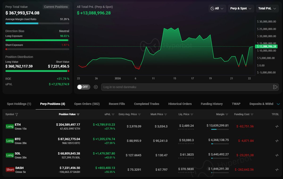 据1月23日引用的链上数据显示,一名出售了255枚比特币的大户投资者(链上标记为“策略交易对手”)在清算了其比特币、以太坊及SOL的多头仓位后,遭受了286万美元的损失。该投资者同时维持着对DASH的5倍杠杆空头仓位,并借此获得了65万美元的收益。目前,其总收益已从原先的2550万美元大幅回落至297万美元...
