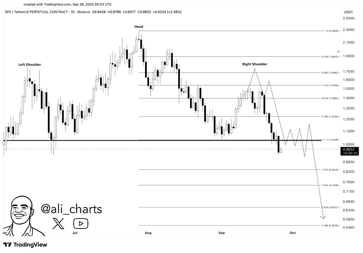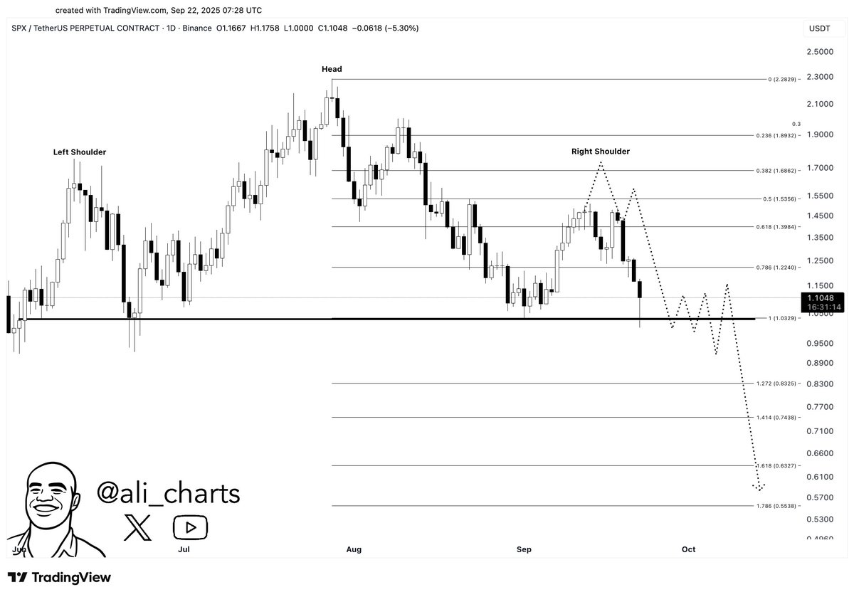 关键洞察SPX6900跌破头肩形态颈线位,下行目标位指向0.58美元。斐波那契延伸位显示0.82美元、0.74美元和0.66美元附近存在支撑,之后可能进一步下跌。分析师警告称,除非价格能重新站上1.00美元关键位,否则当前的反弹仍将十分脆弱。SPX6900关键形态破位后看跌目标0.58美元SPX6900(SPX/USDT)当前报价1.02美元,24小时交易量2790万美元。该代币在过去24小时内上涨5%,但周线仍下跌18%。图表显示其已完成头肩顶形态构筑,该形态通常预示着趋势反转。该结构包含左肩、更高的头部峰值和右肩。颈线位位于1.00美元附近,近期已被跌破。分析师Ali表示:"SPX6900...