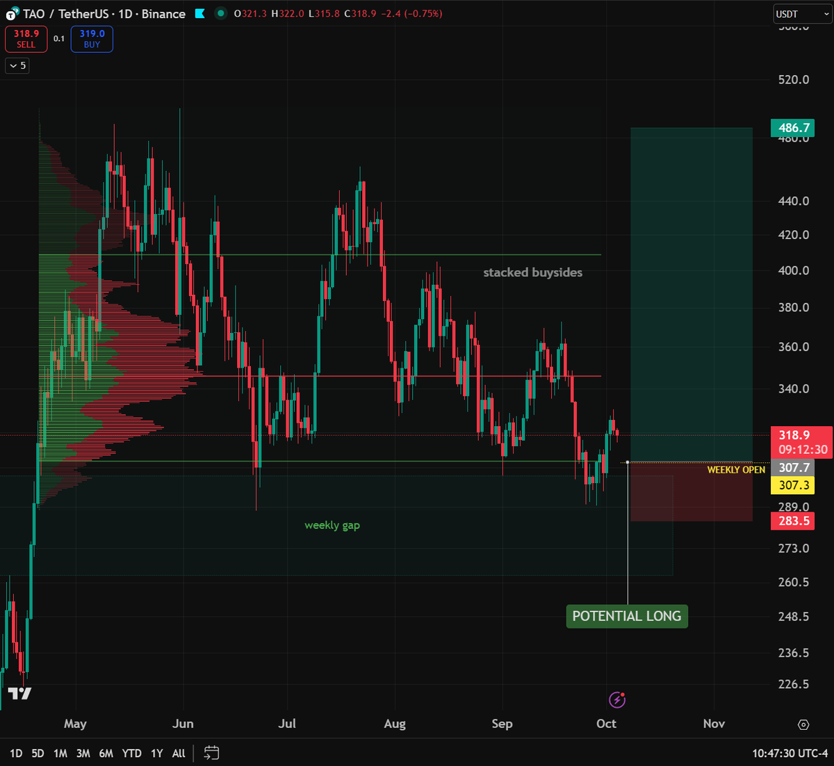加密货币市场小幅回暖,以太坊从3839美元低点反弹至4175美元经历了上周的剧烈波动后,加密货币市场出现轻微复苏迹象。以太坊(ETH)曾跌至3,839美元低点,随后反弹至接近4,175美元水平。今日比特币(BTC)和以太坊(ETH)均上涨近1%,缓解了看跌压力,并提振了包括Bittensor(TAO)在内的多个山寨币的上涨情绪。TAO今日重回上涨区间,虽然涨幅温和,但更重要的是价格走势正在形成看涨反转形态,这可能会决定该代币的下一波主要行情。下降楔形形态显现日线图上,TAO正在形成下降楔形形态——这种技术结构通常预示着抛售动能枯竭和潜在的上行反转可能。近期调整使TAO价格跌至楔形下轨290美元...