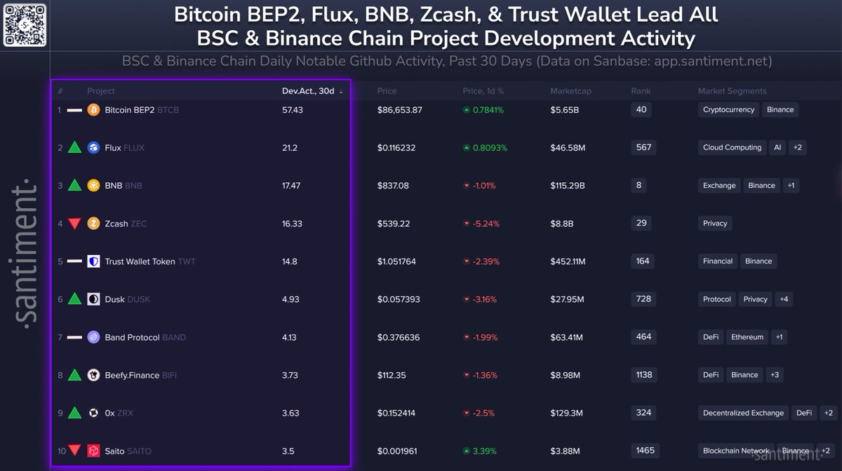 加密货币分析平台发布BSC开发者活动最新排名 加密货币分析平台Santiment近日发布了币安智能链与币安链项目的更新排名,对过去30天内的开发者活动进行了分析。数据显示,比特币BEP2在该网络中展现出最高的开发活跃度。 项目排名变动情况 与上月相比,多个项目的排名出现变化。比特币BEP2保持榜首位置,Flux和BNB分别上升至第二、三位。Zcash则下降一位至第四名。 开发者活跃度具体数据 根据统计,过去30天内BSC网络开发者活跃度最高的项目及得分如下: 比特币BEP2(BTCB)——57.43 Flux(FLUX)——21.2 BNB(BNB)——17.47 Zcash(ZEC)——...